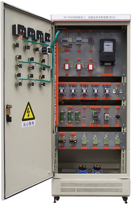 初級電工電拖實訓考核裝置,初級電工考核柜,初級電工實訓考核裝置是按照勞動社會保障部頒發(fā)的“工人技術等級標準”和“職業(yè)技能鑒定規(guī)范”的內容要求,根據(jù)初級電工培訓考核的實際情況而設計的新一代集培訓學習、理論驗證、實際操作能力、考核鑒定于一體的多功能柜式設備。整臺設備以標準的電氣控制柜為主柜,利用柜體的雙面空間,布置電器 及配套實驗器材,能完成初級電工考核鑒定中的電力拖動控制與照明電路的實操項目,該電工、電拖實訓考核裝置堅持理論聯(lián)系實際的原則,突出技能訓練,注重針對性、實用性、科學性,經(jīng)全國多家職業(yè)技能訓練中心、職校、技校使用證明,該柜體設計合理、實操方便,占地面積少。為延長電器的使用壽命,各電器的接點都與接線端子相連,再讓學生在接線端子上接線,連接電機、電器來完成各項控制實驗,有效降低材料消耗,延長使用壽命。該套設備適用于各勞動職業(yè)技能鑒定部門,同時適應各大、中專、技校、職校初級電工、電拖專業(yè)教學與實訓考核。