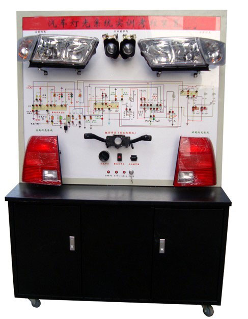 前大燈、前角燈、前霧燈、側(cè)燈、燈光開關(guān)總成、變光開關(guān)總成、尾燈、牌照燈、后霧燈、剎車燈開關(guān)、倒車燈開關(guān)、故障設(shè)置系統(tǒng)、電源、彩色原理與結(jié)構(gòu)圖、控制面板、可移動(dòng)臺(tái)架、使用說(shuō)明書及任務(wù)驅(qū)動(dòng)式實(shí)訓(xùn)指導(dǎo)書等。