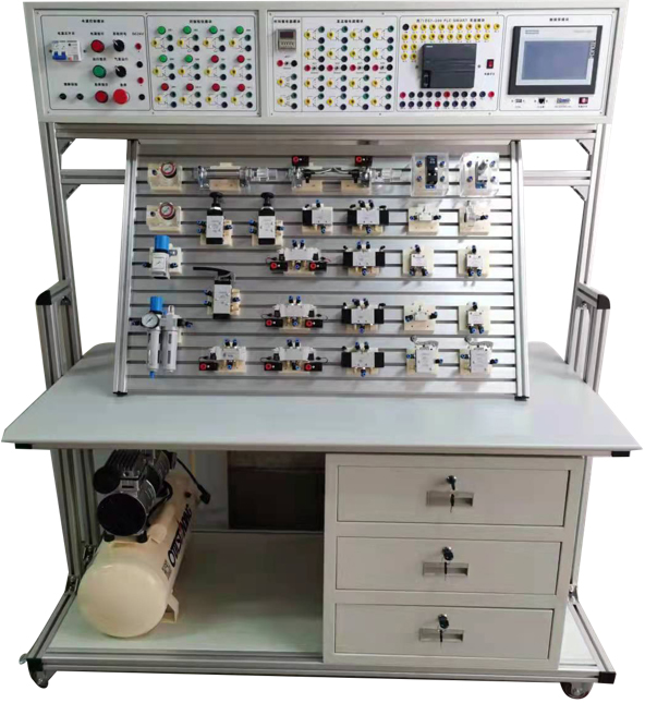 (3)配有控制模塊:電源模塊,PLC控制模塊,繼電器控制模塊,時(shí)間繼電器控制模塊、控制按鈕模塊,氣動(dòng)元件獨(dú)立模塊等。