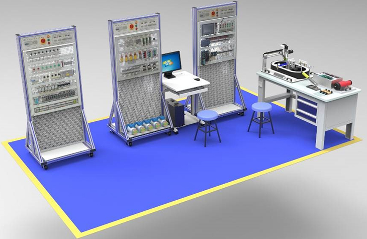 1.2平臺采用立式結(jié)構(gòu)開放式設(shè)計,主體采用 40*80 型材做骨架,周邊采用 Q235 冷扎鋼板做封板,表面靜電噴塑處理,整機(jī)既堅固耐用,又美觀大方。底部裝有帶腳墊萬向輪,萬向輪移動時用,可調(diào)腳固定時用,移動固定兩相宜。頂部安裝電源模塊,中部為實訓(xùn)區(qū)域,依據(jù)任務(wù)安裝不同掛板。