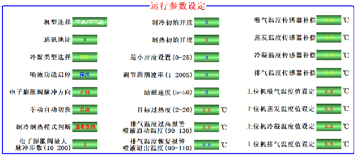 11)、顯示界面上29 路參數(shù)控制參數(shù)設置/查詢:控制器內所有與控制相關的溫度參數(shù)、時間參數(shù)、控制參數(shù)、等29個參數(shù)都可以調整,以適應制冷/熱泵/冷庫/水機等設備。