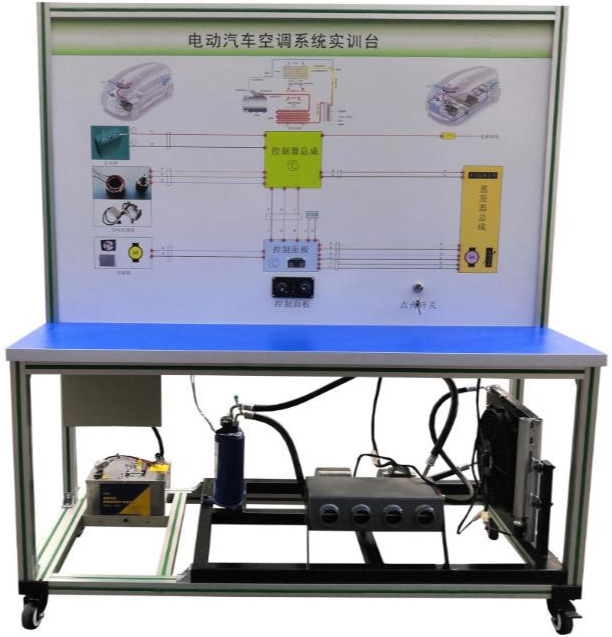 點(diǎn)火開(kāi)關(guān)、電動(dòng)汽車空調(diào)壓縮機(jī)、膨脹閥總成、干燥器總成、鼓風(fēng)機(jī)總成、冷凝器、冷卻電子風(fēng)扇、電動(dòng)空調(diào)壓縮機(jī)控制器總成、空調(diào)蒸發(fā)箱總成、充電器與充電接口、充電插線、DC-DC轉(zhuǎn)換器、鋰電池組、空調(diào)操作面板、高低壓空調(diào)壓力表、采暖模塊總成、電源總開(kāi)關(guān)、急停開(kāi)關(guān)、直流接觸器、輔助蓄電池(12V45AH)、一體化全鋁合金型材搭建的移動(dòng)臺(tái)架(1500×700×1700mm 帶自鎖腳輪裝置,帶安裝檢測(cè)端子的原理面板,面板1448×940mm)、故障模擬與排除裝置、設(shè)備操作說(shuō)明書(shū)。