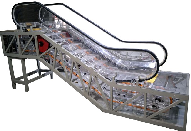 透明教學自動扶梯模型,適用于職業(yè)院校、中職院校電梯技術專業(yè)學員進行自動扶梯梯級拆裝、操縱和維修保養(yǎng)實訓教學訓練。扶梯模擬實訓裝置采用優(yōu)質(zhì)方管焊接密紋噴塑組裝成扶梯桁架,梯級踏板系統(tǒng)、扶手帶系統(tǒng)、曳引機系統(tǒng),設備臺架、安全檢測系統(tǒng),電氣控制控制系統(tǒng)等。