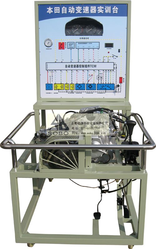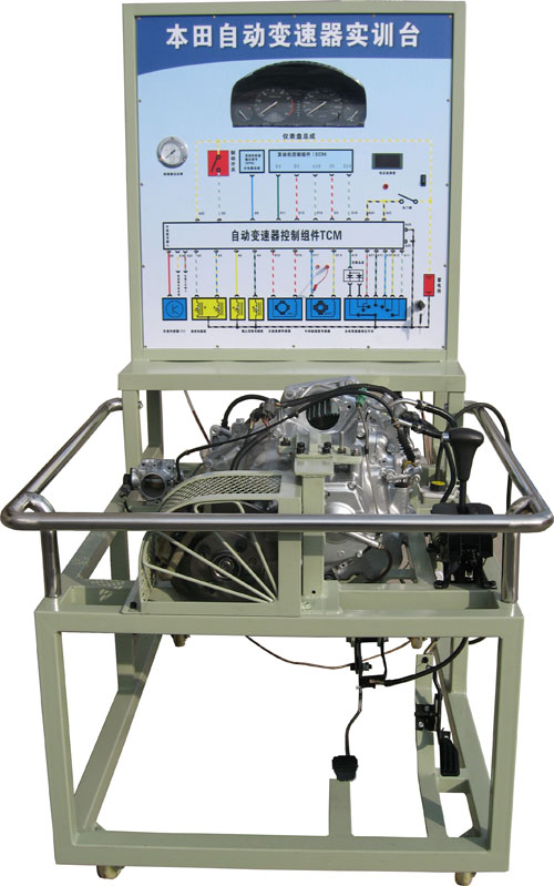 本自動變速器實訓(xùn)臺是本公司采用日本本田公司自動變速器為適應(yīng)汽車教學(xué)需求而研制的,該實訓(xùn)臺由電控變速器(八成新)、操作顯示面板及發(fā)動機彩色電氣原理圖電腦控制柜、可移動式臺架(萬向腳輪)、驅(qū)動系統(tǒng)(腳踏式油門踏板)變頻電機驅(qū)動、剎車系統(tǒng)(腳踏液壓盤試剎車)、啟動系統(tǒng)(電門鎖方式啟動)、車速傳感器、電磁閥執(zhí)行器、原車電腦、具有發(fā)動機運轉(zhuǎn)及顯示(轉(zhuǎn)速.車速.檔位)、液壓油壓力顯示表(顯示換檔過程油壓)、自動變速器電磁閥工作指示LED燈、原車診斷座、進(jìn)行失速實驗等、故障設(shè)置區(qū)可設(shè)置8路故障(老師設(shè)置任一路線路故障)、故障排除區(qū)(學(xué)生通過各種儀器、儀表、)在面板上用專用排故線連接排除故障、傳感器信號模擬等多項功能、具結(jié)構(gòu)緊湊、操作方便、安全可靠、教學(xué)直觀、是汽車自動變速器實物教學(xué)不可缺少的實驗室設(shè)備之一。