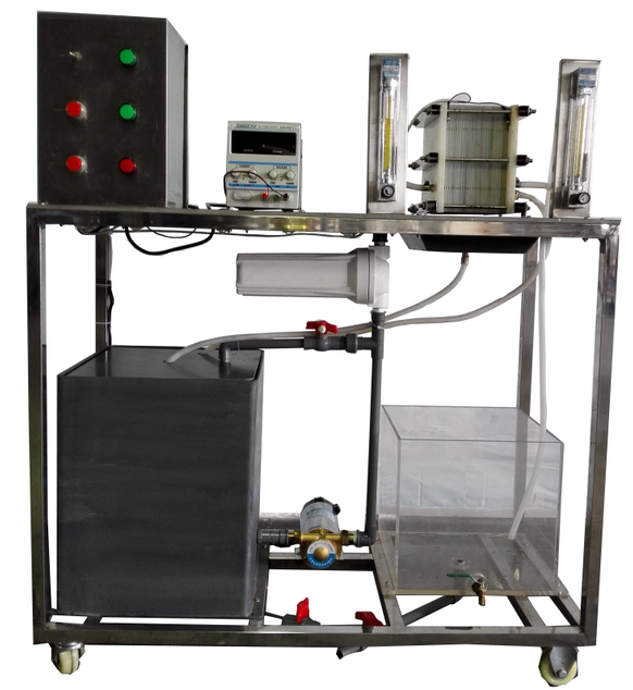 有機(jī)玻璃外箱體、電滲析器、直流穩(wěn)壓電源、配水箱、進(jìn)水泵、流量計(jì)、壓力表、不銹鋼框架、控制屏。